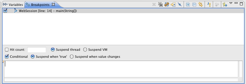 The breakpoints view now provides detail panel to display and edit the breakpoint properties.