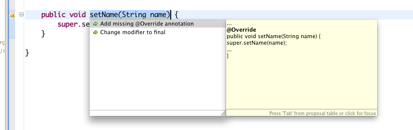 Now the getter and setter for field can be create via the content assist a good alternative to quick assist via CMD+1 (CTRL +1).