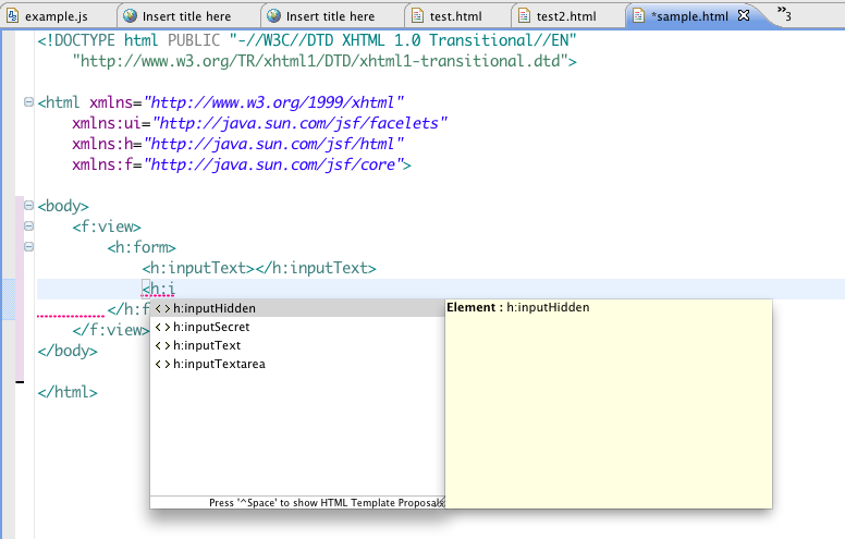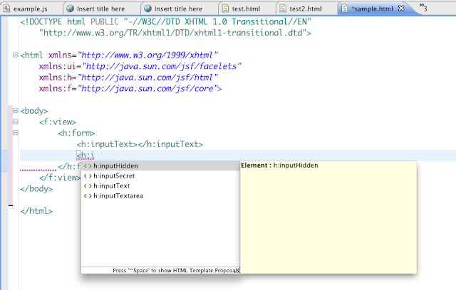 The HTML editor supports know JSF Facelet, which are also part of the JSF 2.0 specification. Now the content assist in the HTML can be used to select the JSF components.